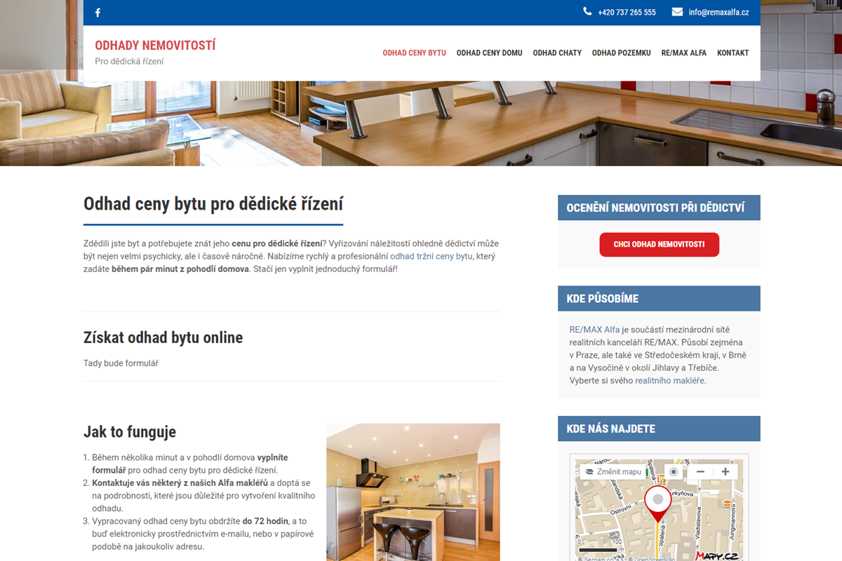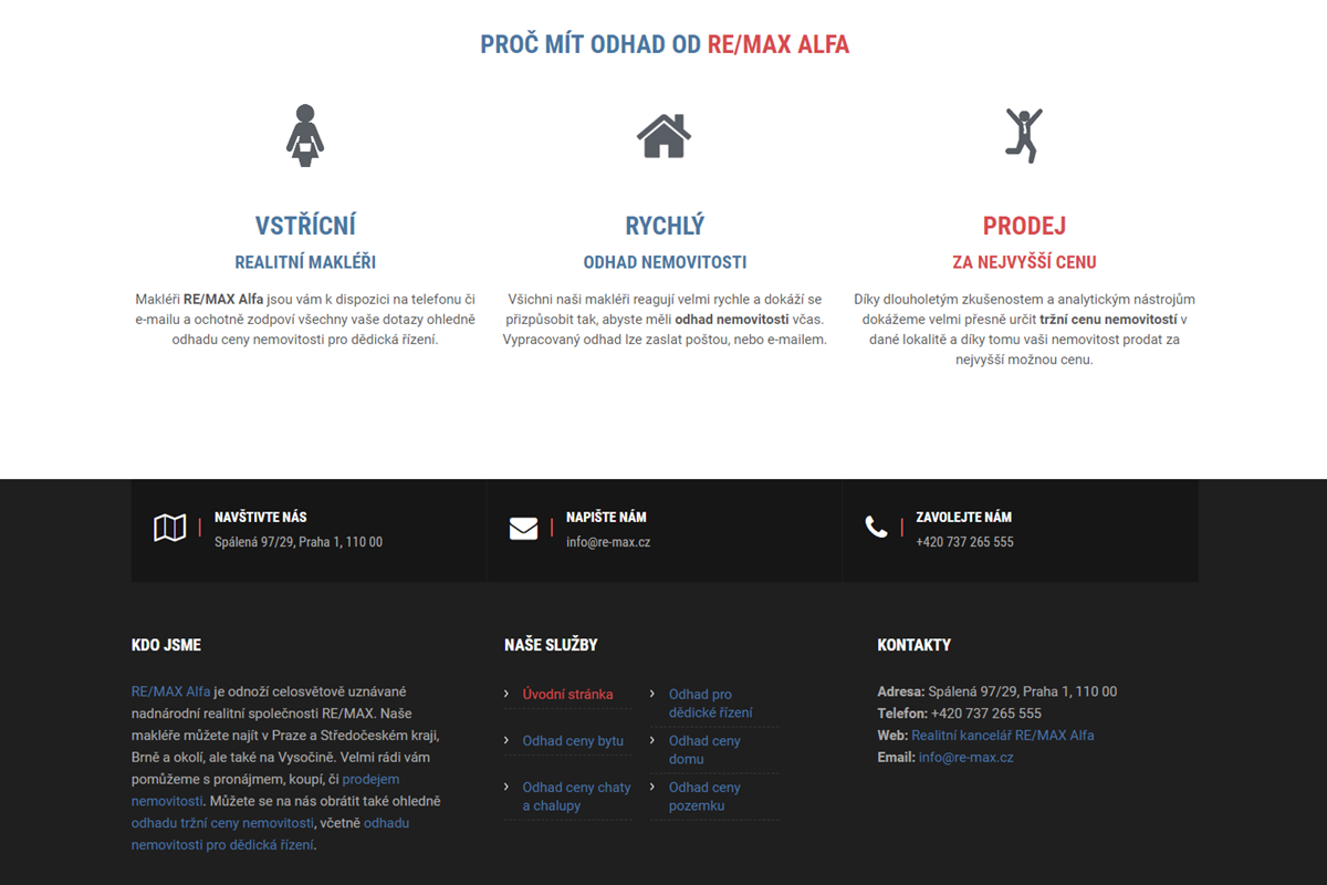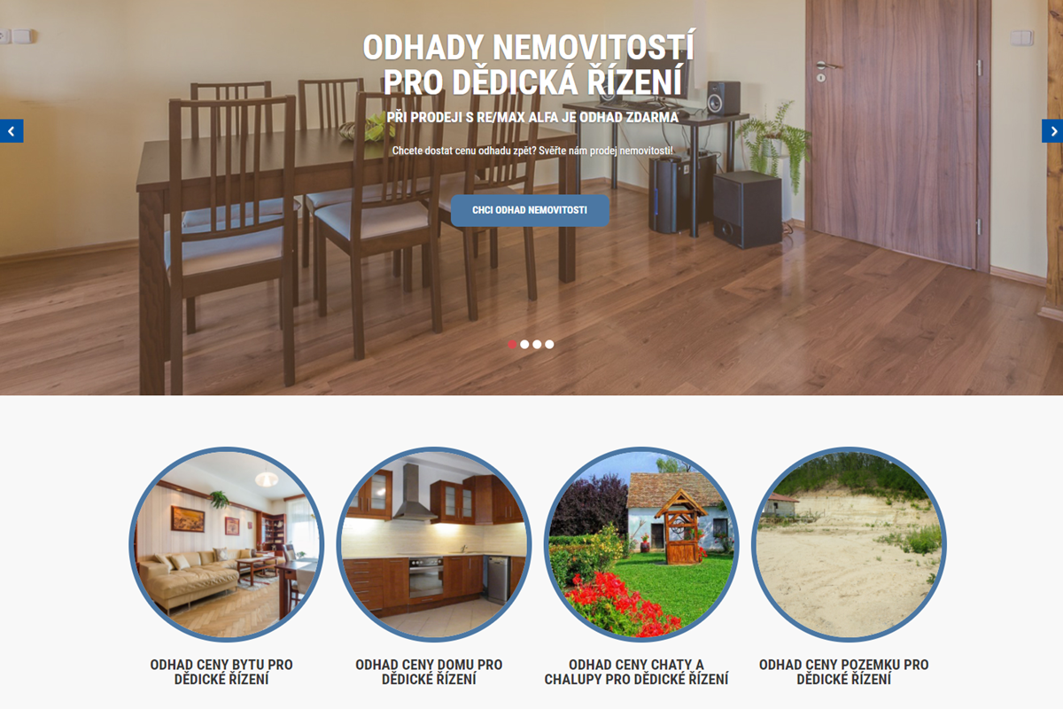 Odhady-nemovitosti-dedicka-rizeni.cz – dědická řízení často zahrnují nemovitost. Vždy je třeba znát její cenu. Proto jsme na míru vytvořili web pro RE/MAX Alfa, který je zaměřený právě na odhady pro dědická řízení. Na stránkách můžete požádat online o vypracování odhadů od zkušených realitních makléřů.